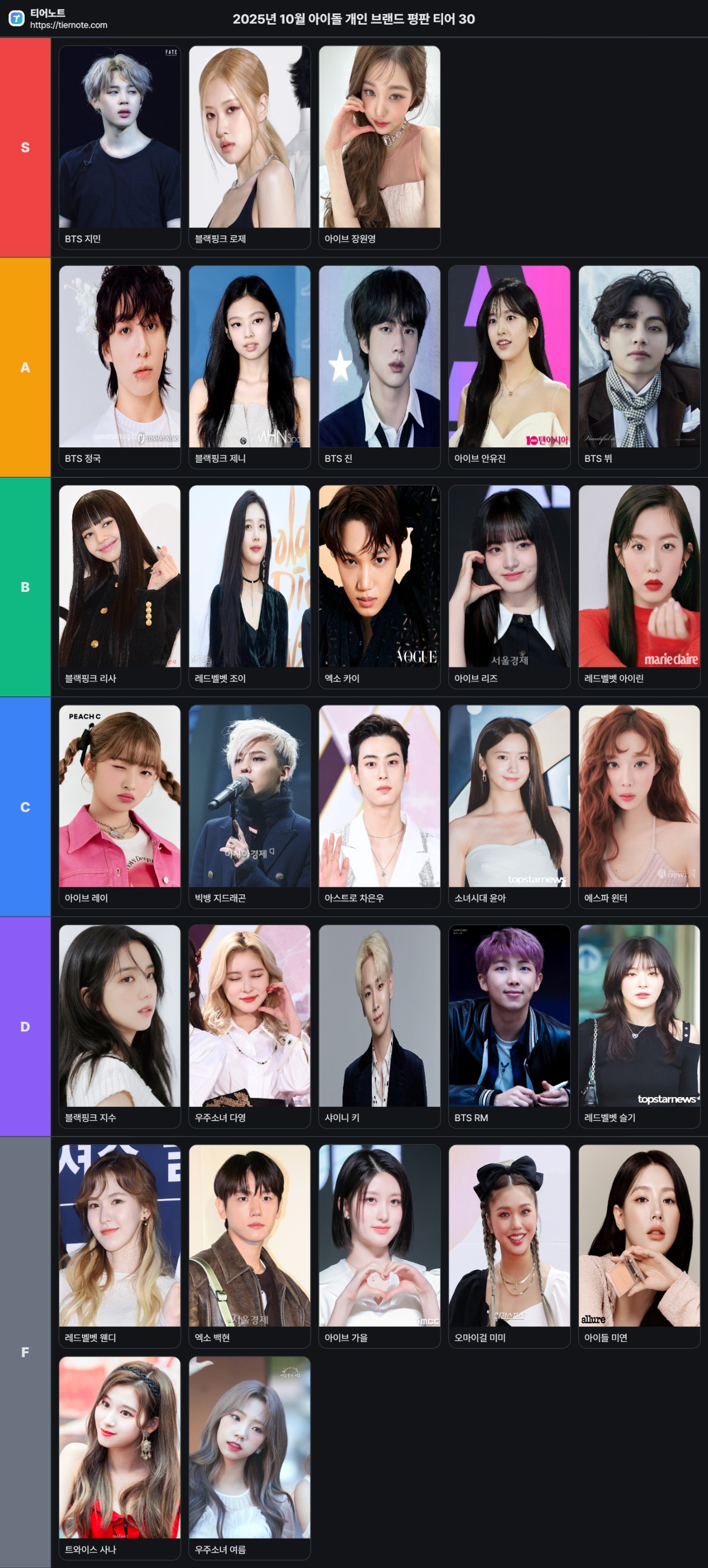 • S티어 : BTS 지민, 블랙핑크 로제, 아이브 장원영