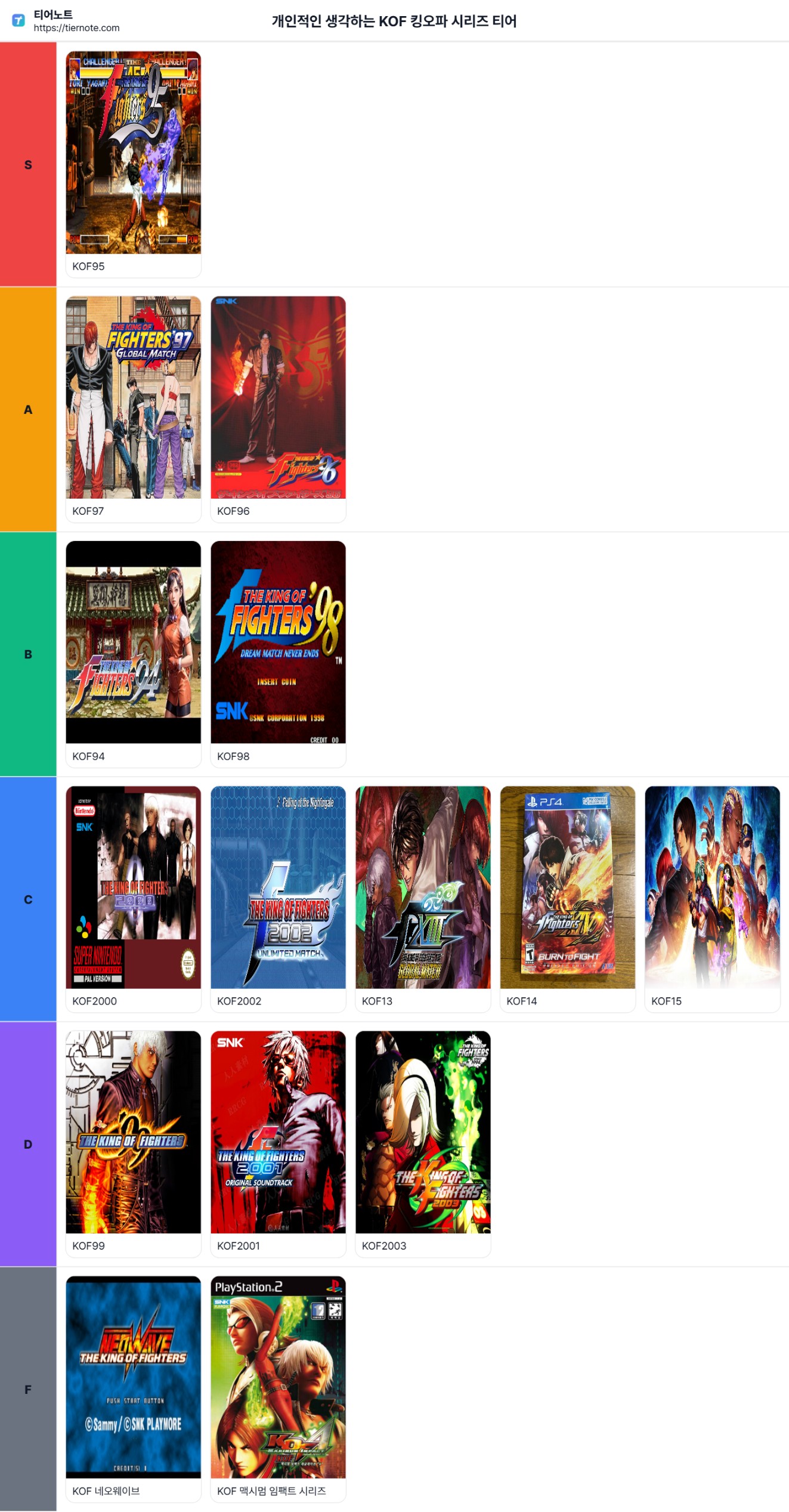 - F티어 : KOF 네오웨이브, KOF 맥시멈 임팩트 시리즈