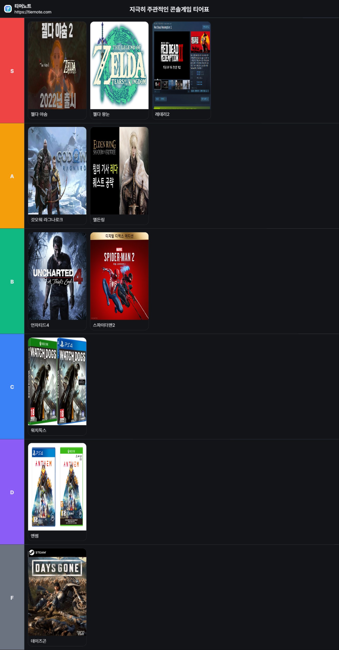 • S티어 : 젤다 야숨, 젤다 왕눈, 레데리2