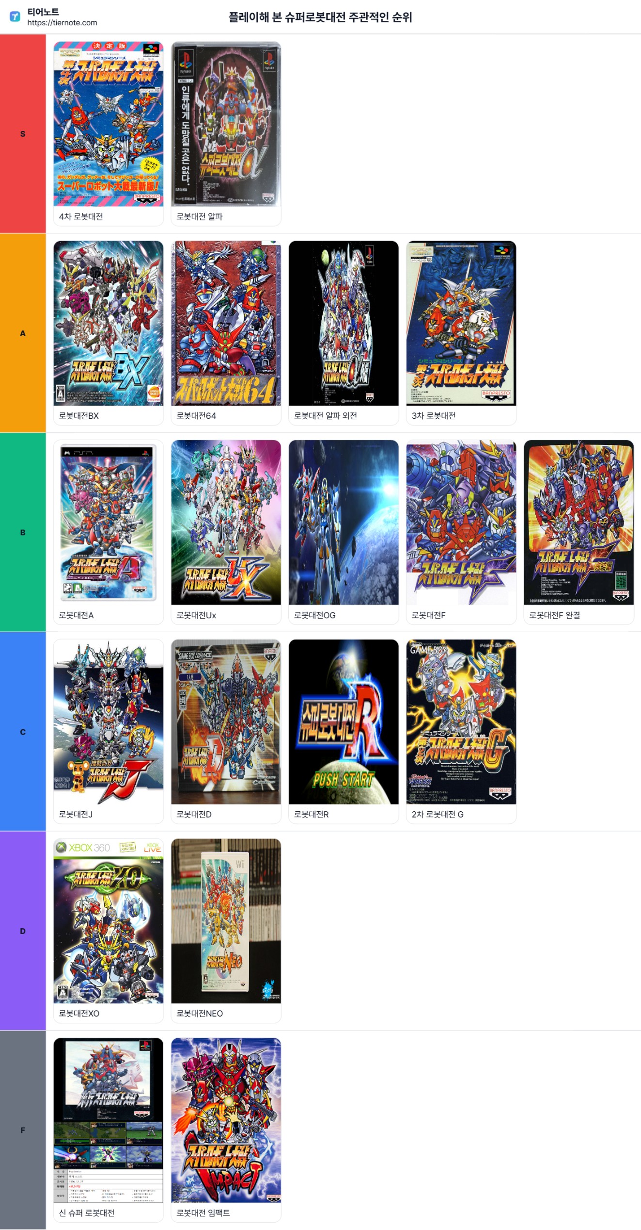 - B티어 : 로봇대전A, 로봇대전Ux, 로봇대전OG, 로봇대전F, 로봇대전F 완결