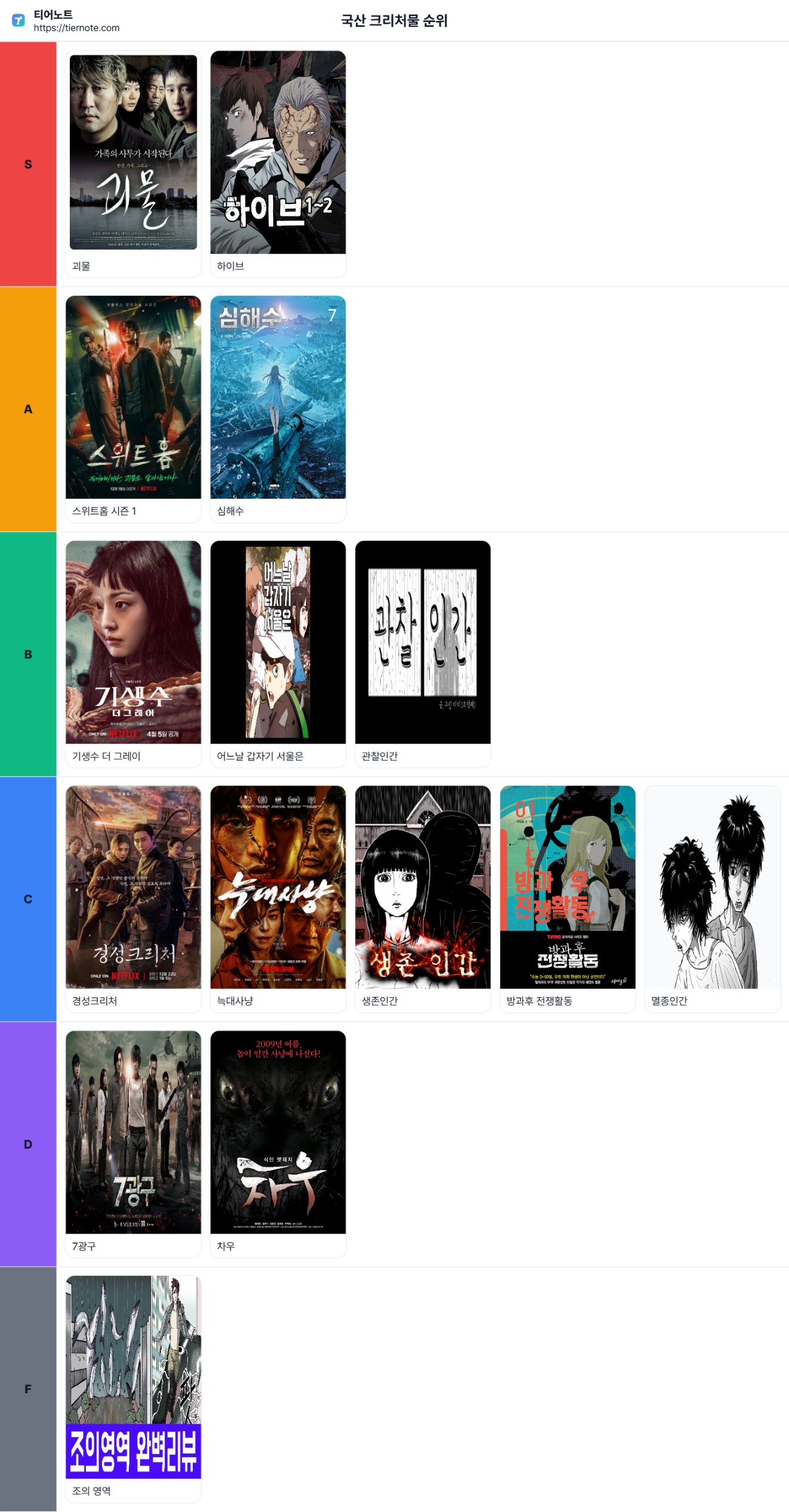 국산 크리처물 순위 티어요약