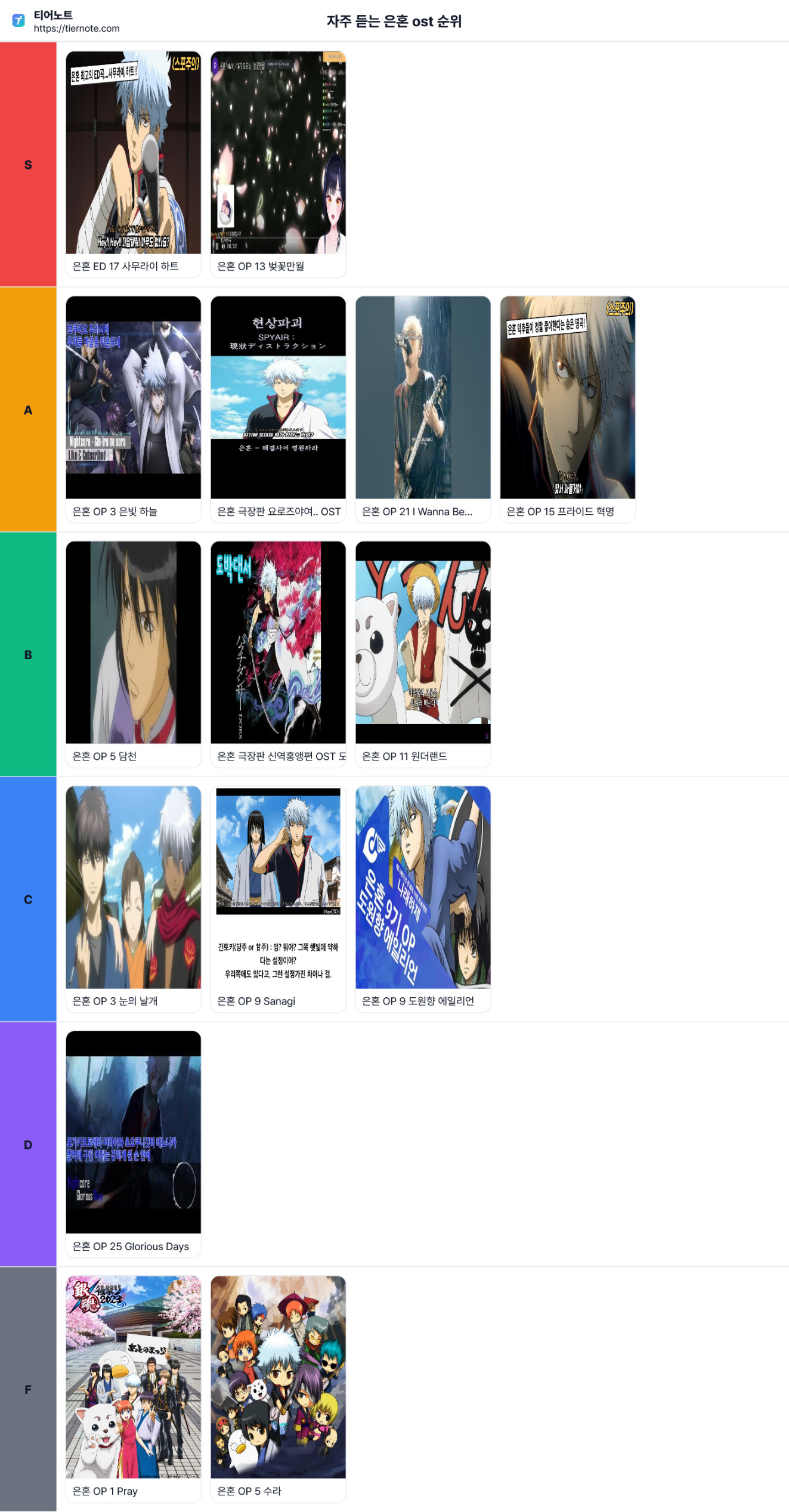 - F티어 : 은혼 OP 1 Pray, 은혼 OP 5 수라