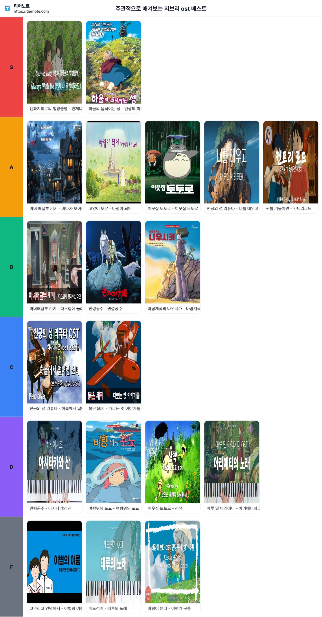 주관적으로 매겨보는 지브리 ost 베스트 티어요약