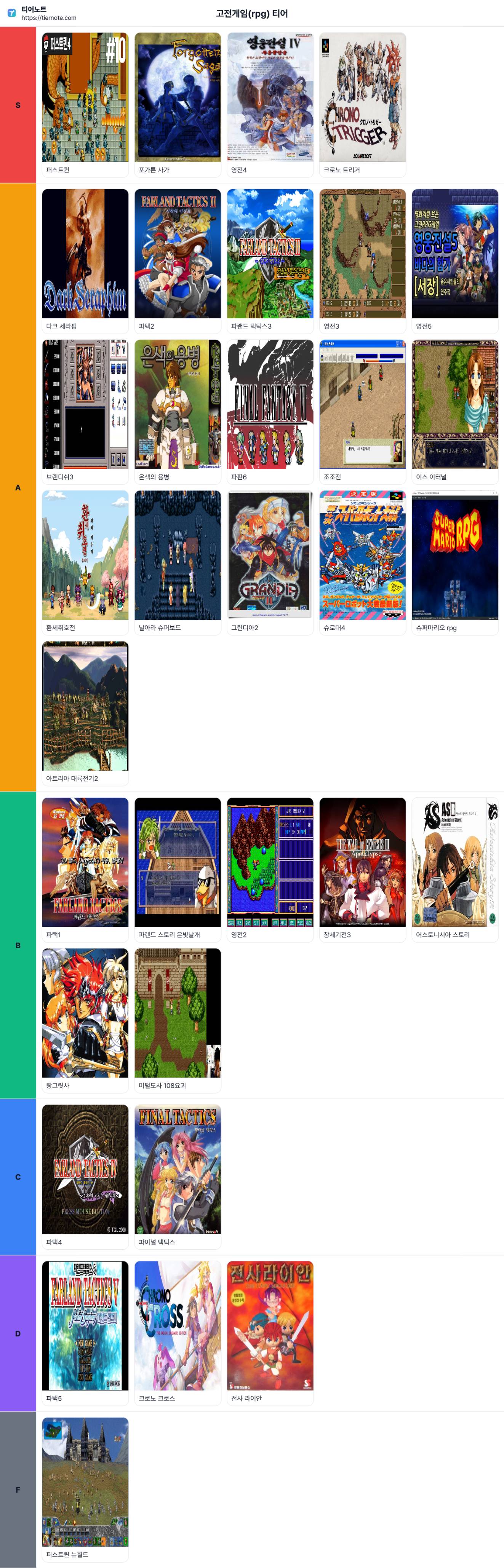 • S티어 : 퍼스트퀸, 포가튼 사가, 영전4, 크로노 트리거