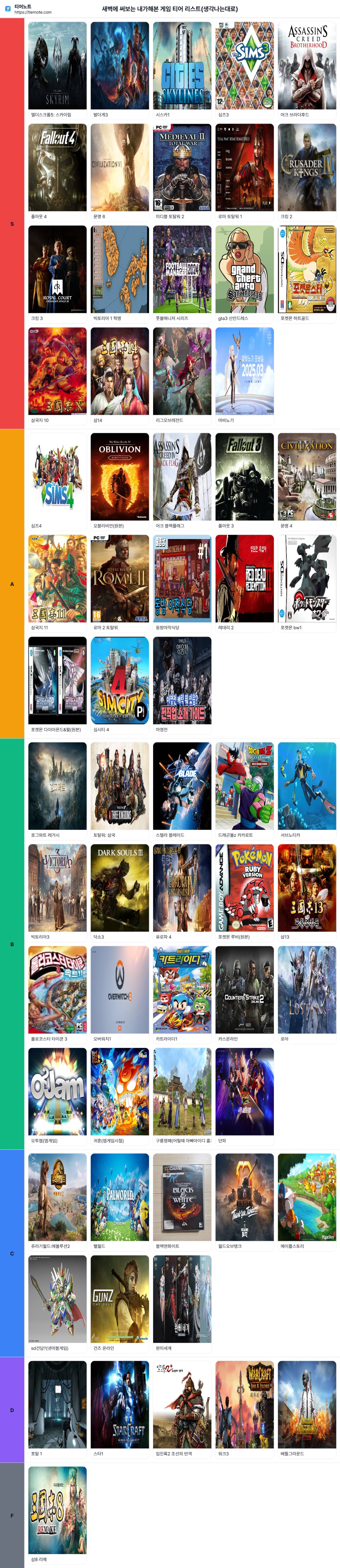 • S티어 : 엘더스크롤5: 스카이림, 발더게3, 시스카1, 심즈3, 어크 브라더후드, 폴아웃 4, 문명 6, 미디블 토탈워 2, 로마 토탈워 1, 크킹 2, 크킹 3, 빅토리아 1 혁명, 풋볼매니저 시리즈, gta3 산안드레스, 포켓몬 하트골드, 삼국지 10, 삼14, 리그오브레전드, 마비노기