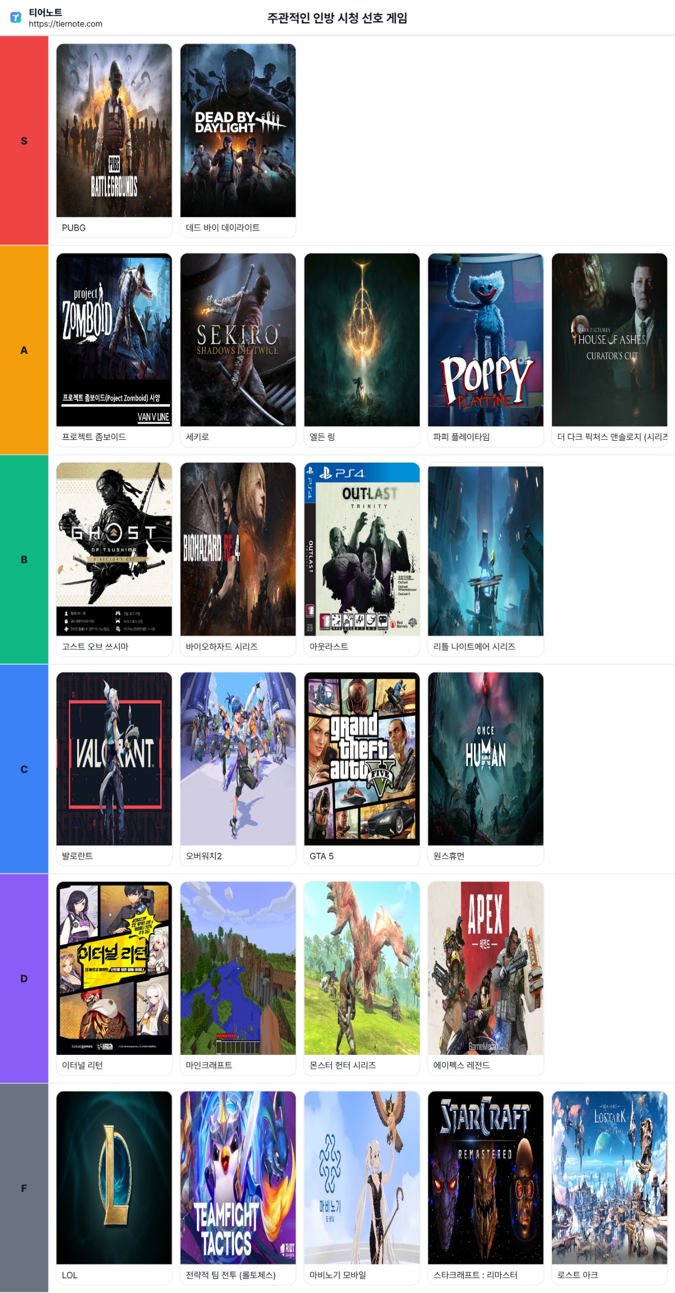 • B티어 : 고스트 오브 쓰시마, 바이오하자드 시리즈, 아웃라스트, 리틀 나이트메어 시리즈