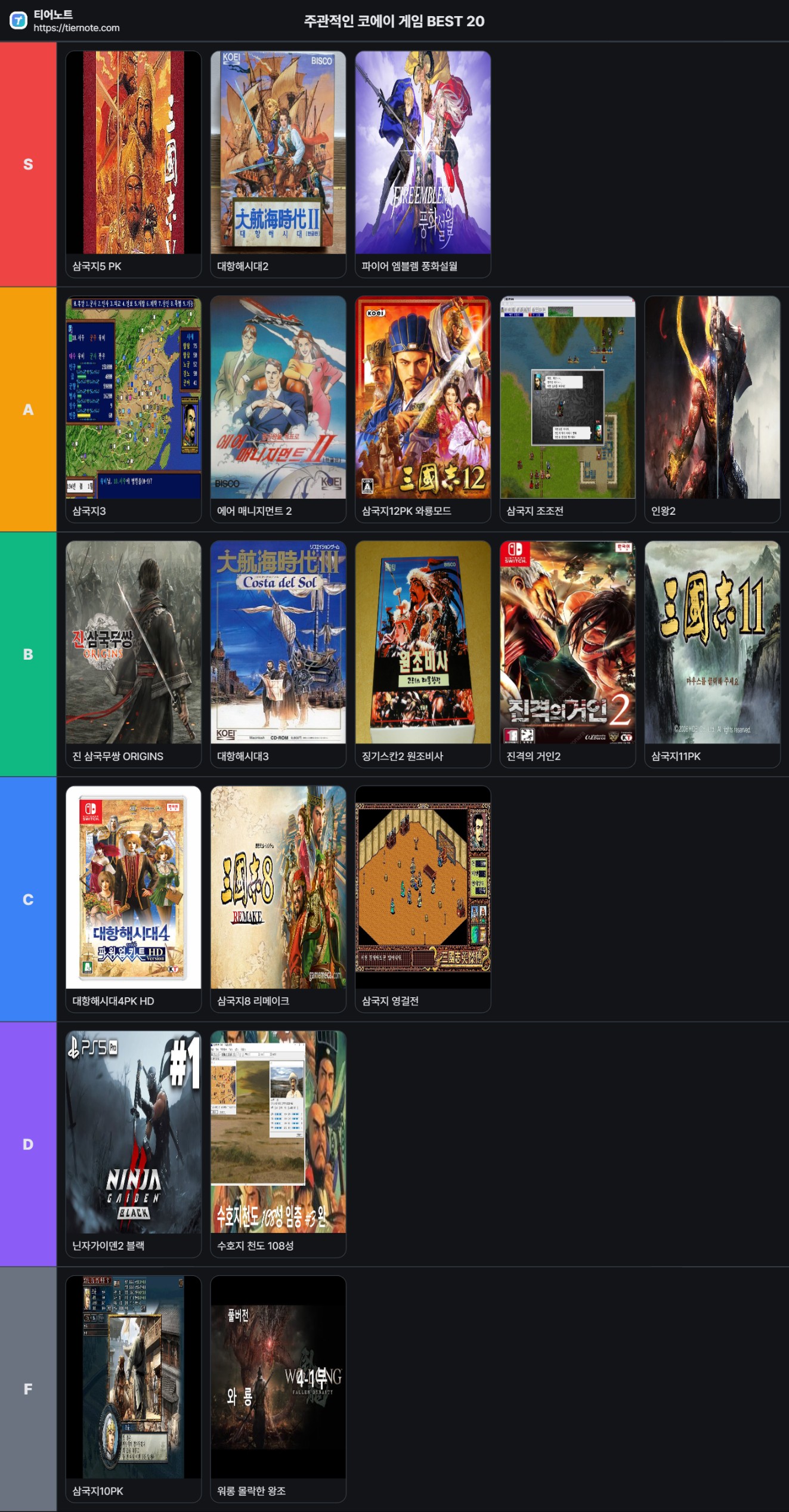 • S티어 : 삼국지5 PK, 대항해시대2, 파이어 엠블렘 풍화설월