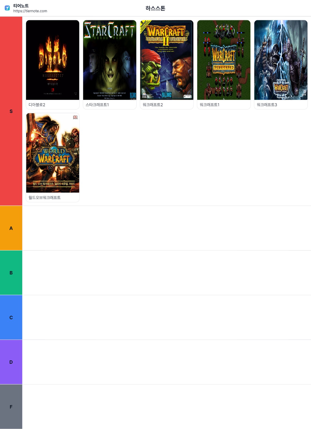 하스스톤 페이지 정보 작성자 유랑쪽지보내기 메일보내기 자기소개 아이디로 검색 전체게시물쪽지보내기 메일보내기 자기소개 아이디로 검색 전체게시물 작성일10.11 22:02 1조회 0추천 목록 본문 티어표 다운로드 S디아블로2스타크래프트1워크래프트2워크래프트1워크래프트3월드오브워크래프트ABCDF 하스스톤 티어요약S티어 : 디아블로2, 스타크래프트1, 워크래프트2, 워크래프트1, 워크래프트3, 월드오브워크래프트A티어 : 없음B티어 : 없음C티어 : 없음D티어 : 없음F티어 : 없음 0추천 SNS 공유 신고 차단 댓글 0 로그인한 회원만 댓글 등록이 가능합니다. 이전글 다음글 목록