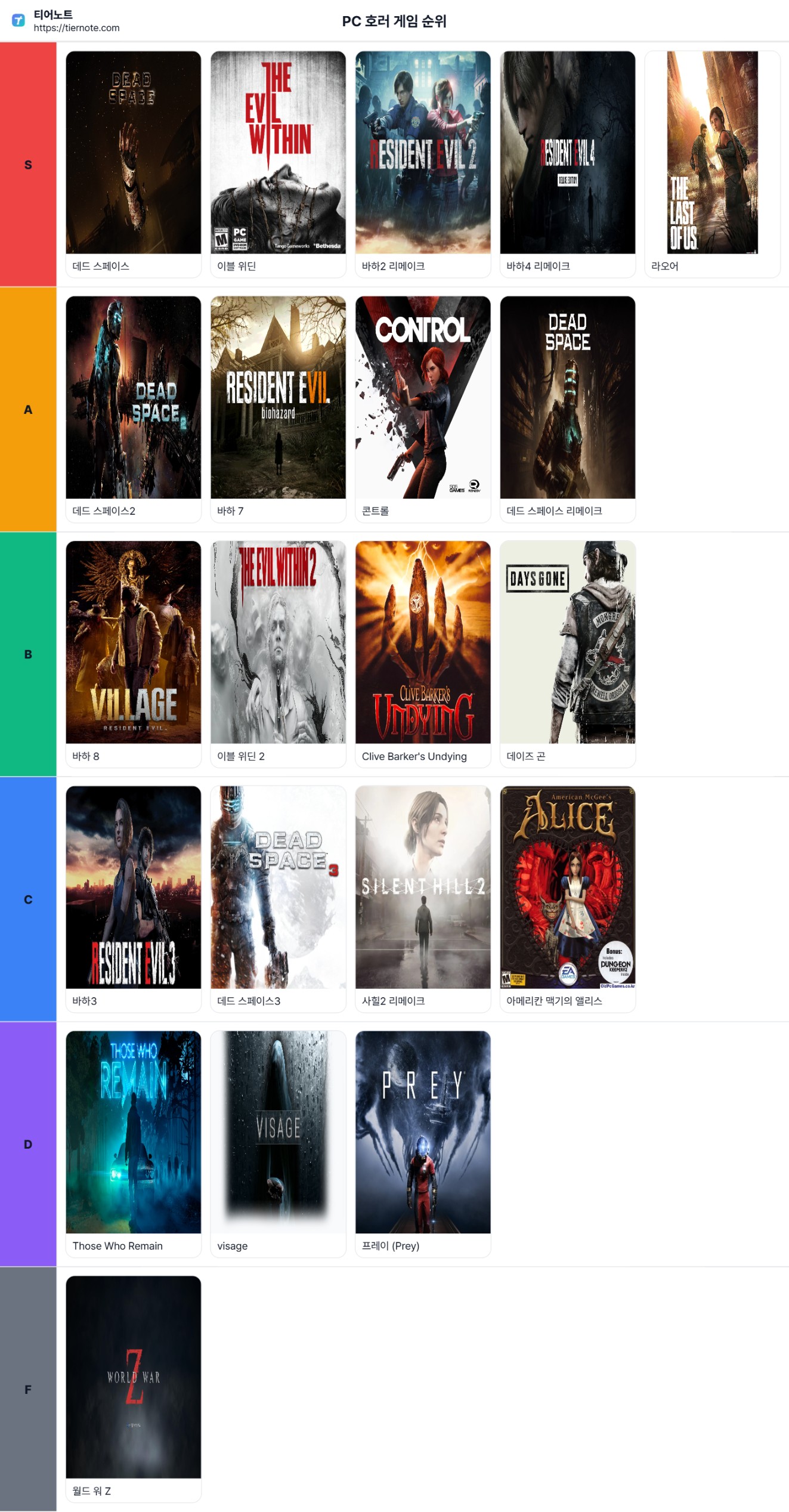 - A티어 : 데드 스페이스2, 바하 7, 콘트롤, 데드 스페이스 리메이크
